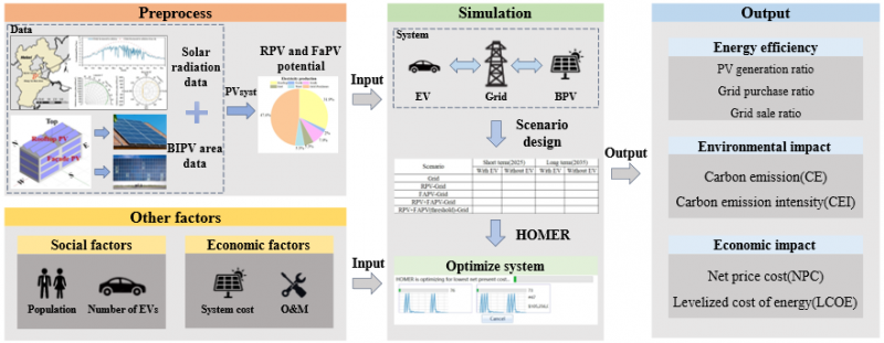 At present, there is still a lack of research on the environmental and economic analysis of BIPV systems including facade photovoltaics (FaPV). In this regard, this study proposes a coupled development model of “building photovoltaics + electric vehicles” in newly built cities, which can achieve effective renewable energy utilization and carbon reduction. The study establishes a comprehensive assessment framework (Figure 1) to optimize the overall economic benefits of urban BIPV-EV integrated systems, and evaluates the energy-environment-economy (3E) potential of BIPV-EV integrated systems under multiple scenarios, filling the research gap on the economic potential of facade photovoltaics.
