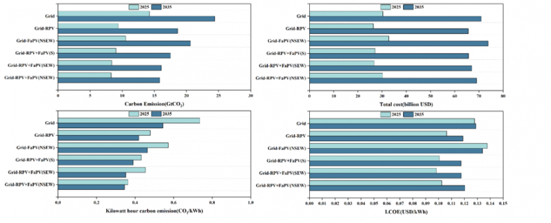 The results show that BIPV-EV systems can effectively reduce CO2 emissions and lower electricity costs (Figure 2). Specifically, compared with BIPV systems that only use rooftop photovoltaics (RPV), the installation of FaPV can increase power generation by up to 67.60%. In terms of urban decarbonization, the adoption of BIPV systems can reduce CO2 emissions by 41.91% in the short term and 34.99% in the long term. The evaluation of the levelized cost of energy (LCOE) for different schemes indicates that the configurations of RPV+FaPV (SE)-EV and RPV+FaPV (SW)-EV systems are the most cost-effective options in both the short and long term, in which BIPV accounts for 48.10% and 31.90% of the total power generation, respectively.