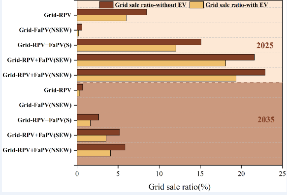 In addition, regarding EV coupling, under the scenarios with the greatest short-term and long-term potential of PV systems, the adoption of EVs can reduce the electricity sales ratio by 15.38% and 30.20%, respectively (Figure 3). Therefore, although the incorporation of EVs into the power system complicates the energy structure, operation mode, and related scheduling methods of the existing power system, it solves the problem of electricity consumption when PV power generation is excessive.
