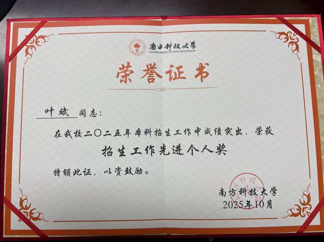 Receiving the title of “Outstanding Individual in Undergraduate Admissions Work 2025” affirms Dr. Ye’s contributions and also serves as encouragement for all admissions staff at SUSTech. Looking ahead, Dr. Ye will continue to devote himself with enthusiasm and professionalism to the university’s admissions and talent cultivation endeavors, contributing further to SUSTech’s development into a world-class research university.